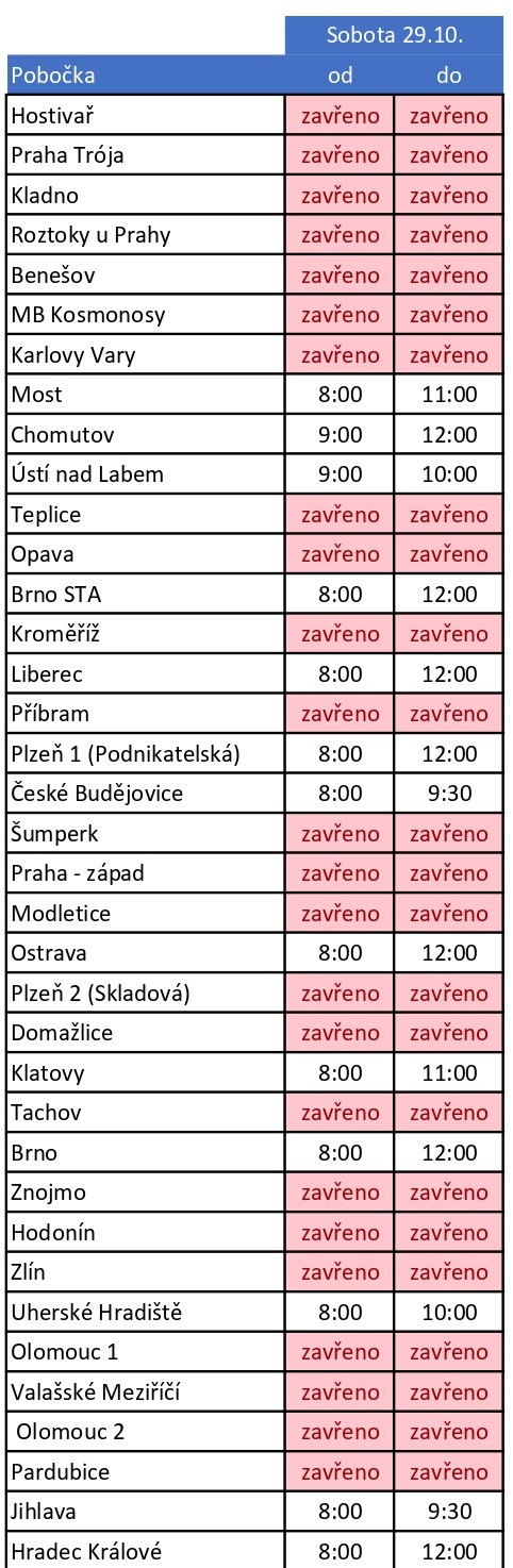 Otevírací doba poboček v sobotu 29.10.2022