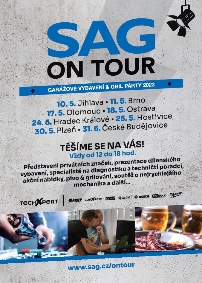 sagontour plakatNa osm vybraných prodejen autodílů SAG v květnu zamíří série regionálních předváděcích akcí SAG ON TOUR s podtitulem „GARÁŽOVÉ VYBAVENÍ & GRIL PÁRTY 2023“ a celodenním programem. Ten zákazníkům nabídne možnost prohlédnout si i vyzkoušet spoustu dílenského vybavení, nářadí a vybraných produktů. Chybět nebude ani oblíbené pivo s grilovanou klobásou a vše zpestří také soutěže o atraktivní ceny nebo jen tak pro zábavu.