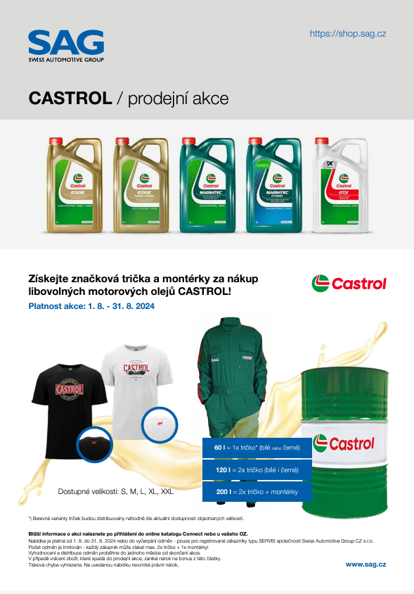 castrol letakV srpnu jsme pro vás připravili speciální akci na motorové oleje Castrol, takže kvalitní péče o motor nyní přináší i stylové odměny! Při dosažení cílového měsíčního objemu nákupů olejů Castrol EDGE, MAGNATEC a GTX získáte exkluzivní dárky v retro designu Castrol. Podle dosaženého objemu získáte jedno nebo dvě retro trička Castrol, která jsou nejen stylová, ale i pohodlná. Při větším nákupu můžete navíc získat i montérkovou kombinézu, ideální pro každodenní práci v dílně nebo garáži.