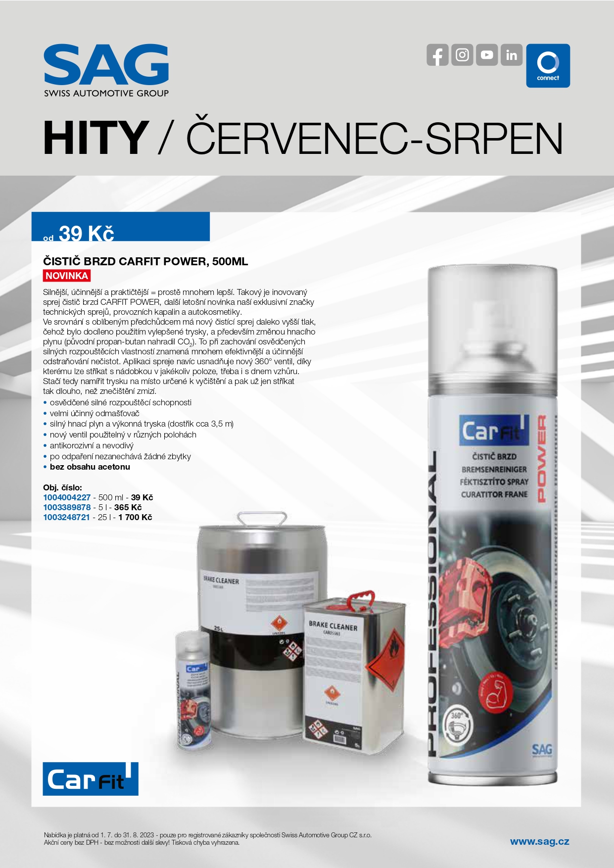 SAG HITY červenec-srpen 2023 na titulní straně představují nedávno inovovaný sprej CARFIT POWER Čistič brzd i s jeho variantami v průmyslovém balení (pro použití v opakovaně plnitelných lahvích s rozprašovačem).